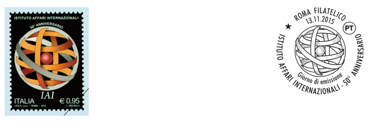 Poste Italiane comunica che il Ministero dello Sviluppo Economico ha emesso il giorno 13 novembre 2015, un francobollo celebrativo dell’Istituto per gli Affari Internazionali, nel 50° anniversario della fondazione, nel valore di € 0,95.