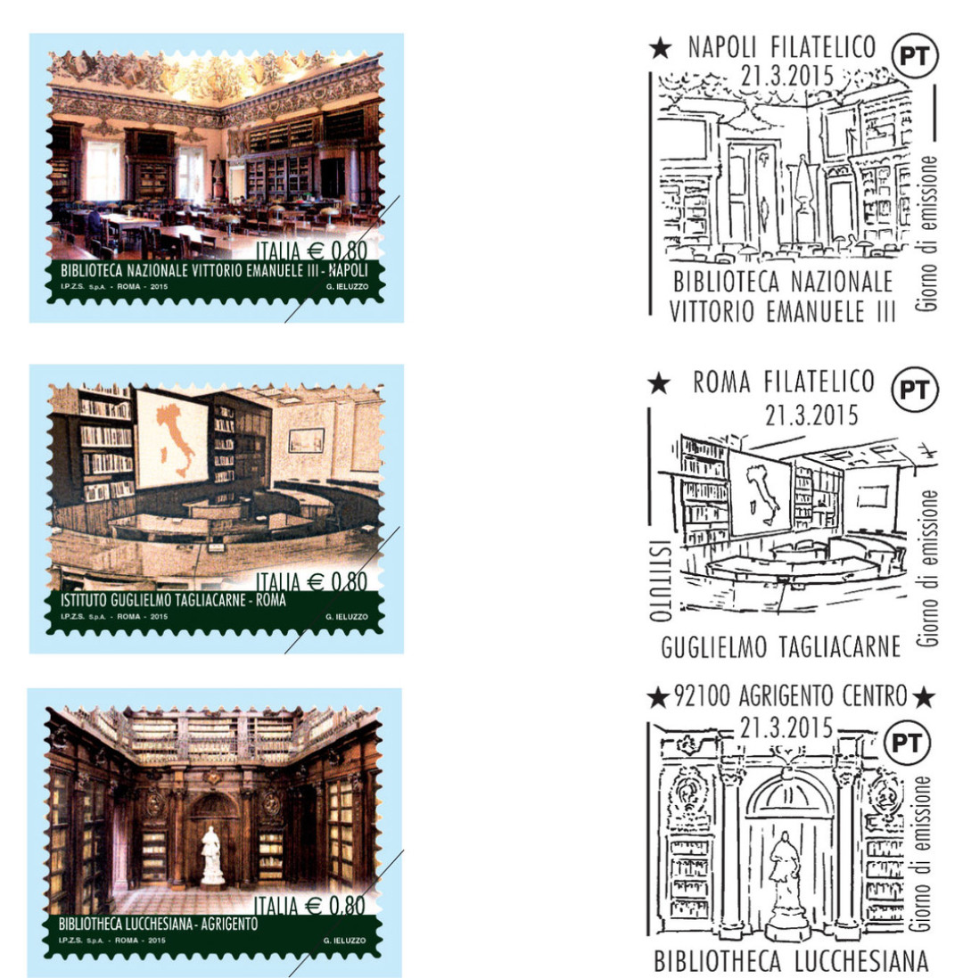 Completano i francobolli le rispettive leggende “BIBLIOTECA NAZIONALE VITTORIO EMANUELE III – NAPOLI”, “ISTITUTO GUGLIELMO TAGLIACARNE – ROMA” e “BIBLIOTHECA LUCCHESIANA – AGRIGENTO”, la scritta “ITALIA” e il valore “€ 0,80”.
