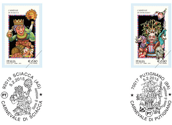 Poste Italiane comunica l’emissione, per il giorno 5 febbraio 2015, di due francobolli ordinari appartenenti alla serie tematica “le Ricorrenze” dedicati al Carnevale di Sciacca ed al Carnevale di Putignano, nel valore di € 0,80 per ciascun soggetto.