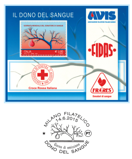 Completano il francobollo la leggenda “GIORNATA MONDIALE DEL DONATORE DI SANGUE”,
