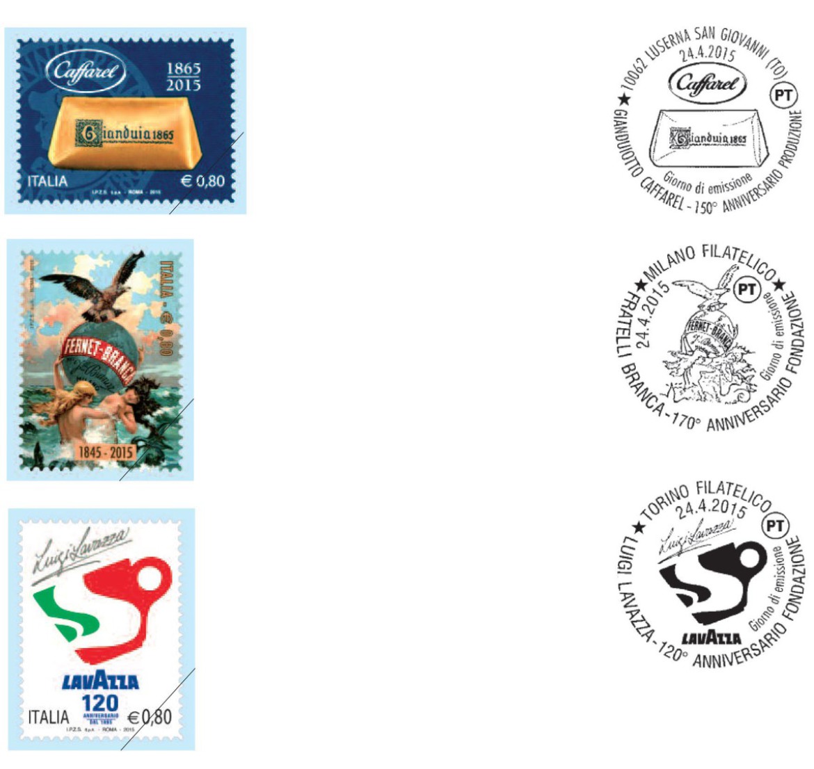 Poste Italiane comunica che il Ministero dello Sviluppo Economico ha emesso il giorno 24 aprile 2015, tre francobolli ordinari appartenenti alla serie tematica “le Eccellenze del sistema produttivo ed economico” dedicati a: Gianduiotto Caffarel, nel 150° anniversario della produzione, Fratelli Branca, nel 170° anniversario della fondazione, Luigi Lavazza, nel 120° anniversario della fondazione, nel valore di € 0,80 per ciascun francobollo.