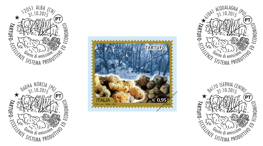francobollo la leggenda “TARTUFO”, la scritta “ITALIA” e il valore “€ 0,95”.