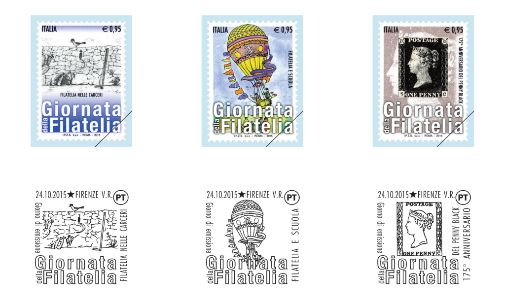 Poste Italiane comunica che il Ministero dello Sviluppo Economico ha emesso il giorno 24 ottobre 2015, tre francobolli celebrativi della Giornata della Filatelia, nel valore di € 0,95 per