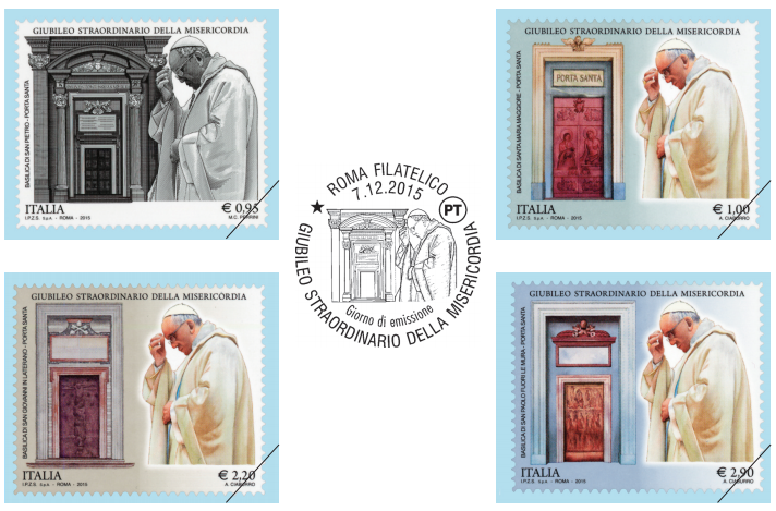 Poste Italiane comunica che il Ministero dello Sviluppo Economico ha emesso il giorno 7 dicembre 2015, quattro francobolli celebrativi del Giubileo Straordinario della Misericordia, nei valori di € 0,95, € 1,00, € 2,20, € 2,90.