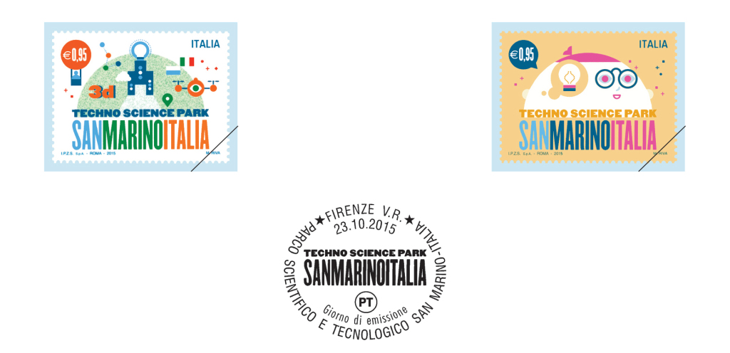Poste Italiane comunica che il Ministero dello Sviluppo Economico ha emesso il giorno 23 ottobre 2015, due francobolli celebrativi del Parco Scientifico e Tecnologico San Marino – Italia