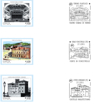 Emissione di sette francobolli ordinari appartenenti alla serie tematica “il Patrimonio artistico e culturale italiano” dedicati a: Teatro Stabile di Torino, Forte di Fenestrelle, Castello Malatestiano di Longiano, Teatro Petrarca in Arezzo, Museo Archeologico Nazionale della Sibaritide, Castello della Colombaia in Trapani e Tempio di Santa Maria della Consolazione in Todi .