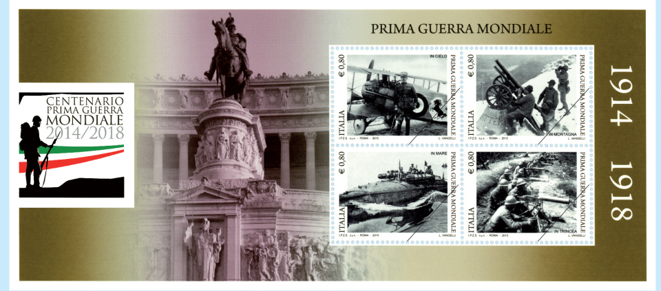 Poste Italiane comunica che il Ministero dello Sviluppo Economico emetterà il giorno 24 maggio 2015, quattro francobolli celebrativi della Prima Guerra Mondiale (racchiusi in un foglietto),
