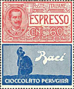Gli andò meno bene quando pensarono di approfittare dell'occasione offerta dalle Poste italiane, nel 1924, con la creazione dei cosiddetti francobolli pubblicitari, che tuttavia rimasero in circolazione per breve tempo, fra mille polemiche. In particolare fu proprio l'immagine dei due innamorati della Perugina, posta sotto l'effige del Re Vittorio Emanuele III, a dare la scandalosa impressione di un Sovrano maliziosamente complice di quanto avveniva sotto i suoi occhi.