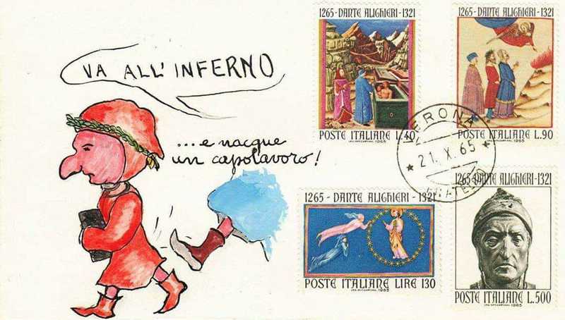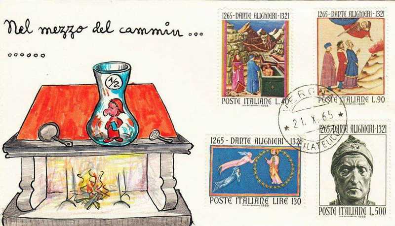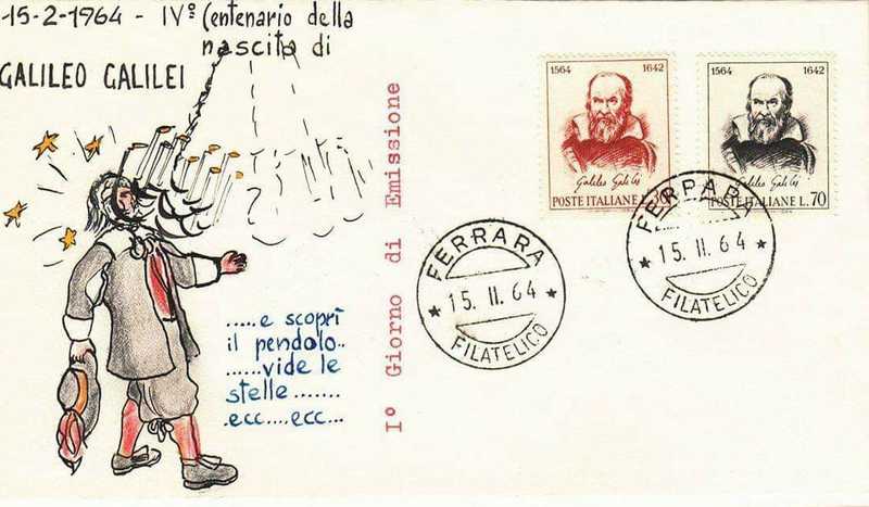 Simpatiche vignette accanto ai francobolli su anniversari della nostra storia da Galilei, a Verdi, da Michelangelo a Dante, etc.