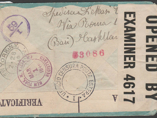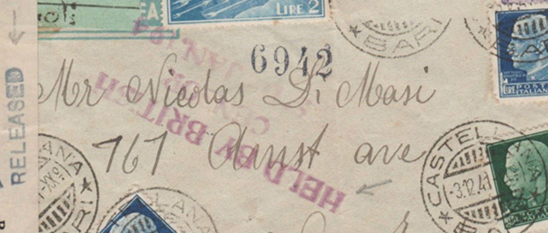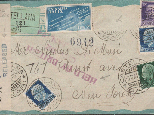 Figura 1 e 2: Busta raccomandata da Castellana (Bari) il 3 Dicembre 1941 ed arrivata a New York il 28 Febbraio 1946 per essere consegnata a destino l'1 Marzo 1946 (Collezione privata M.L.)