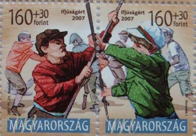 In tutte le città moderne esiste una Via Pál, una strada di periferia sottratta ai giochi dei ragazzi per essere cementificata. Ai ragazzi della Via Pál dell'omonimo romanzo dello scrittore Ferenc Molnár (1878 - 1952) Budapest ha dedicato questo singolare monumento ... e le Poste magiare, nel 2007, in occasione del centenario della prima edizione del libro, una serie di francobolli da 160 fiorini (due dei quali qui riprodotti) con un sovrapprezzo di 30 fiorini destinati al finanziamento di iniziative sociali