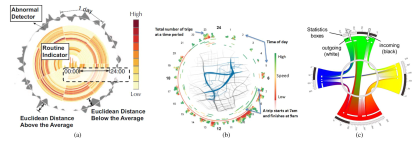 In order to enhance conventional multivariate data visualization techniques, these are integrated with specially designed visual encoding and interaction schemes. For instance, Figure 2 depicts a representation invented to show the distribution of taxis, average speed of taxis and pick-up/drop-off activities on roads. Statistics of attributes of taxis (e.g., speed and vehicle density), value of attributes at each time, and the Euclidean distance against the average are simultaneously illustrated.