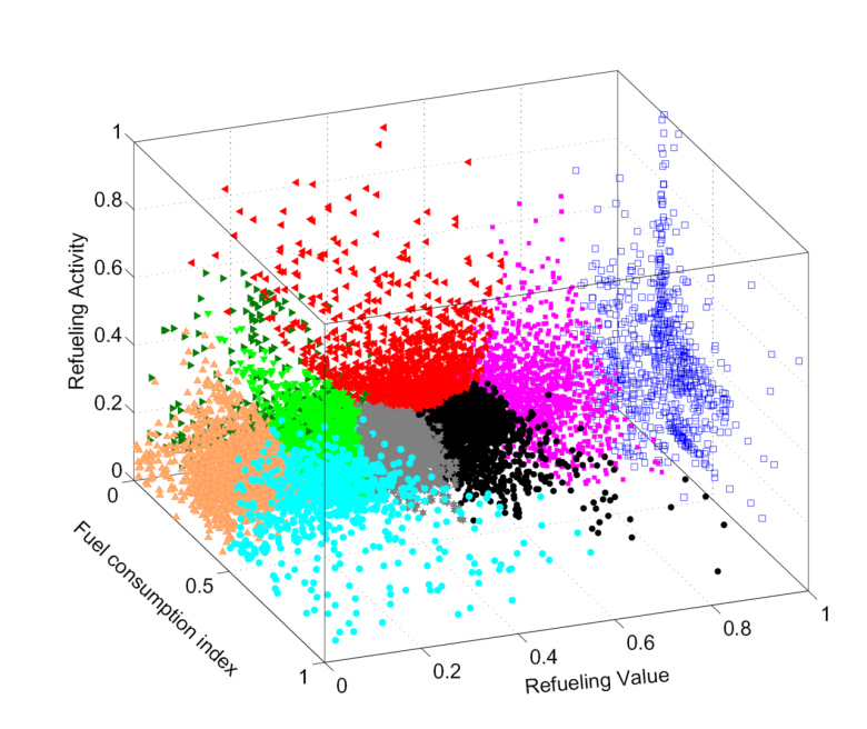 In other words, vehicle clustering aims at grouping together vehicles with the same behavior in terms of cost and fuel consumption. This section describes two predictive indicators, i.e., Vehicle Value and Refueling Activities, and a retrospective index: Average Fuel Consumption Index, which are proposed in a prototype in order to cluster carrier according their usage and performances.