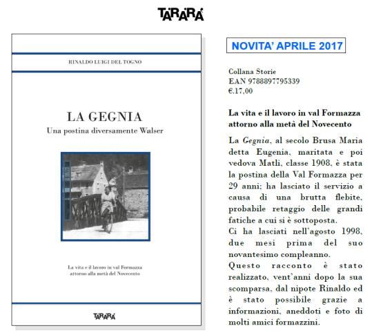 Come si può essere diversamente walser? Leggere “La Gegnia” del narratore per caso Rinaldo Luigi Del Togno, edito da Tararà, può chiarire le idee. Il libro è un po’ raccolta di ricordi personali, un po’ omaggio alla figura straordinaria di una zia materna, un po’ vademecum sull’evoluzione della val Formazza nel corso del XX secolo: tre aspetti trattati n modo non schematico che anzi si integrano e diventano complementari. Per ottenere il perfetto amalgama Del Togno, per il quale narrare sta diventando un imperativo categorico, ha avuto dalla sua una prosa scorrevole e impeccabile nella quale inserire le colorite espressioni dialettali, la capacità evocativa, la sottile ironia con la quale valutare le bizzarrie dell’umana natura. La Gegnia del titolo, postina di Formazza per un trentennio, è Maria Brusa detta Eugenia, ossolana di nascita e formazzina di adozione, avendo sposato Efisio Matli di Canza. Una zia simpatica e socievole quanto premurosa senza essere iperprotettiva. Sulla sua esperienza di vita in alta val Formazza si innesta il racconto delle comunità di montagna: usi, abitudini strutture delle solide collettività walser, dove la fatica non spaventa e dove il passato sopravvive in certe convinzioni e in certe libertà. Della Formazza dei villaggi e degli alpeggi si apprendono gli antichi ritmi della vita e del lavoro negli anni del grande cambiamento, ovvero del boom economico che cambiò la fisionomia delle valli alpine. Su questo variegato sfondo prendono rilievo l’infanzia felice dell’autore, il terribile inverno del 1951, l’incomprensibile ostilità della Trini – suocera della protagonista. “La Gegnia” ha confermato le qualità di narratore che Del Togno ha rivelato a sé e al mondo con la singolare verve dei “Racconti del PICC” nati intorno a un’esperienza di chemioterapia, arricchendo la schiera dei più dotati narratori locali.