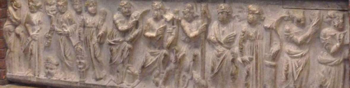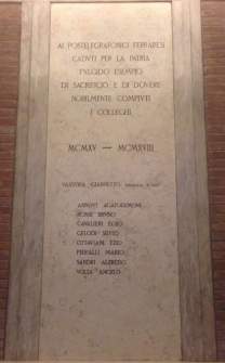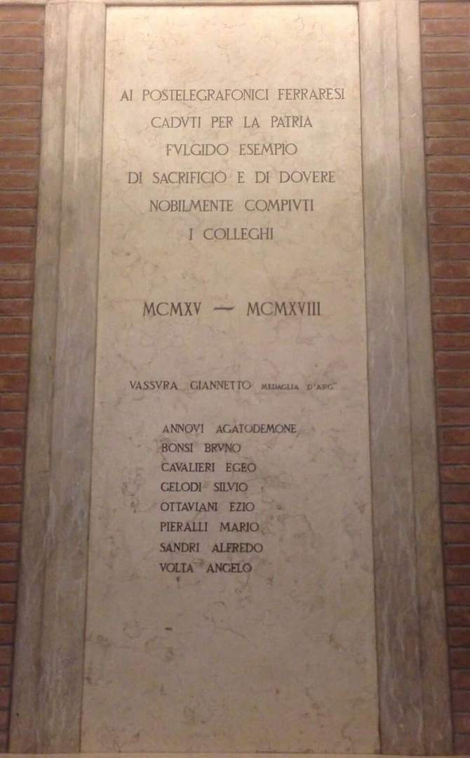 All'interno del Palazzo delle Poste di Ferrara, sotto una lapide ai Postelegrafonici ferraresi caduti nella Grande Guerra vi è questo sarcofago romano di marmo del III sec. che rappresenta le Muse al cospetto di Apollo e Atena. Il monumento sarebbe stato collocato dall'architetto Angiolo Mazzoni con l'intento di dare alla città, storicamente priva di origini romane, una testimonianza di quella romanità altrimenti assente.