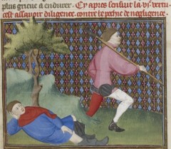 Il corriere postale (sopra raffigurato con i simboli della professione: il lungo bastone da viaggio e la bolgetta rotonda appesa al fianco) è simbolo della Diligenza nell’atto di superare la Negligenza, rappresentata dal corriere addormentato.Miniatura di Jacques Legrand. Bibliothèque Nationale de France, Français 1023, dettaglio del f.29r (Diligence et Negligence). Jacques Legrand, Le livre de bonnes mœurs. c1400-1410.